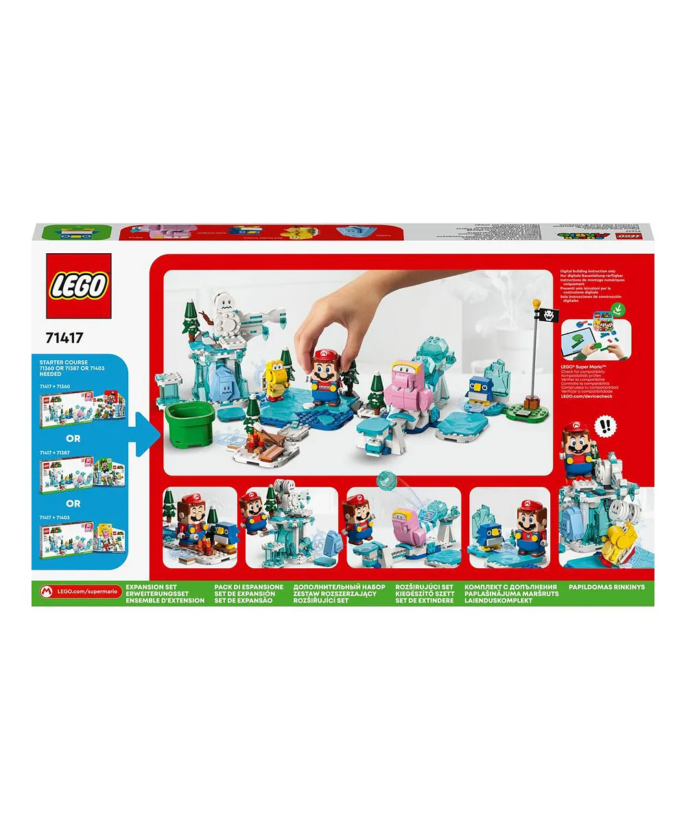 يمكن للأطفال إضافة مستوى جليدي مشوّق إلى عالم LEGO® Super Mario™‎ مع مجموعة التوسيع مغامرة فليبروس الثلجية (71417)، التي تضم 4 شخصيات من Super Mario™‎. ويحرز اللاعبون عملات رقمية معدنية لمساعدة الشخصيات LEGO® Mario™‎، أو لويجي™ من LEGO®‎، أو LEGO® Peach™‎ (غير مضمّنة) على هزيمة كوبا تروبا الأحمر، وفريزي وفليبروس، كما يتزلجون على الجليد، ويتدفؤون بجوار النار ويمنحون عنصر فاكهة مخفية إلى البطريق الصغير كهدية. (ملاحظة: مسار المبتدئين 71360، أو 71387، أو 71403 مطلوب للعب.)