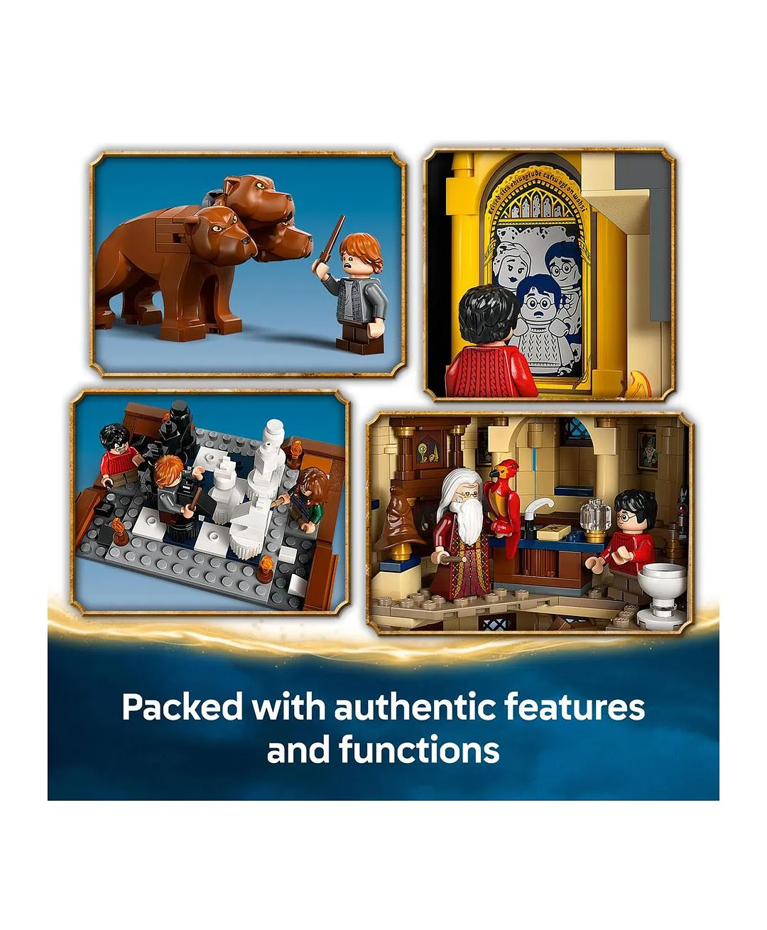 قلعة هوغوارتس ليغو بتفاصيل أصلية – باب أرضي للهروب من غرفة فلافي، وفخ الشرير الذي يعمل بالزناد، ووظيفة المفاتيح الطائرة، والدرج الدوّار الكبير المؤدي إلى مكتب دمبلدور، ومرآة إيرسيد وغير ذلك الكثير