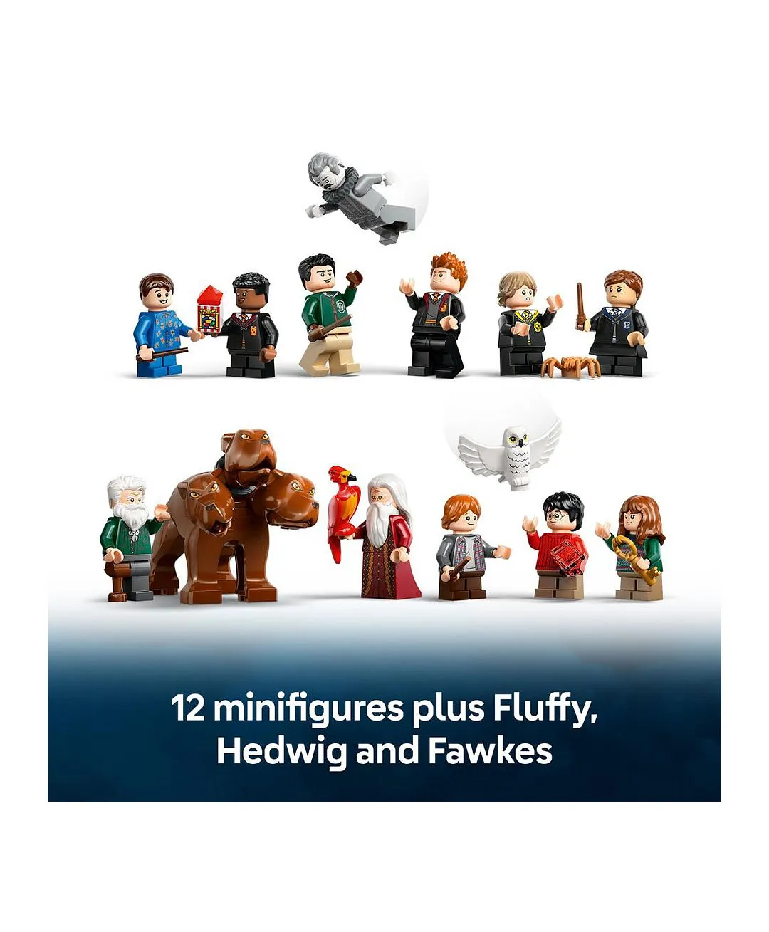 تتضمن مجموعة لعب القلعة اللعبة الممتعة والقابلة للتجميع 12 شخصية صغيرة من ليغو Harry Potter بالإضافة إلى فلافي وهدويغ وفاوكس لإعادة تمثيل المشاهد الكلاسيكية وسرد قصص ساحرة جديدة.