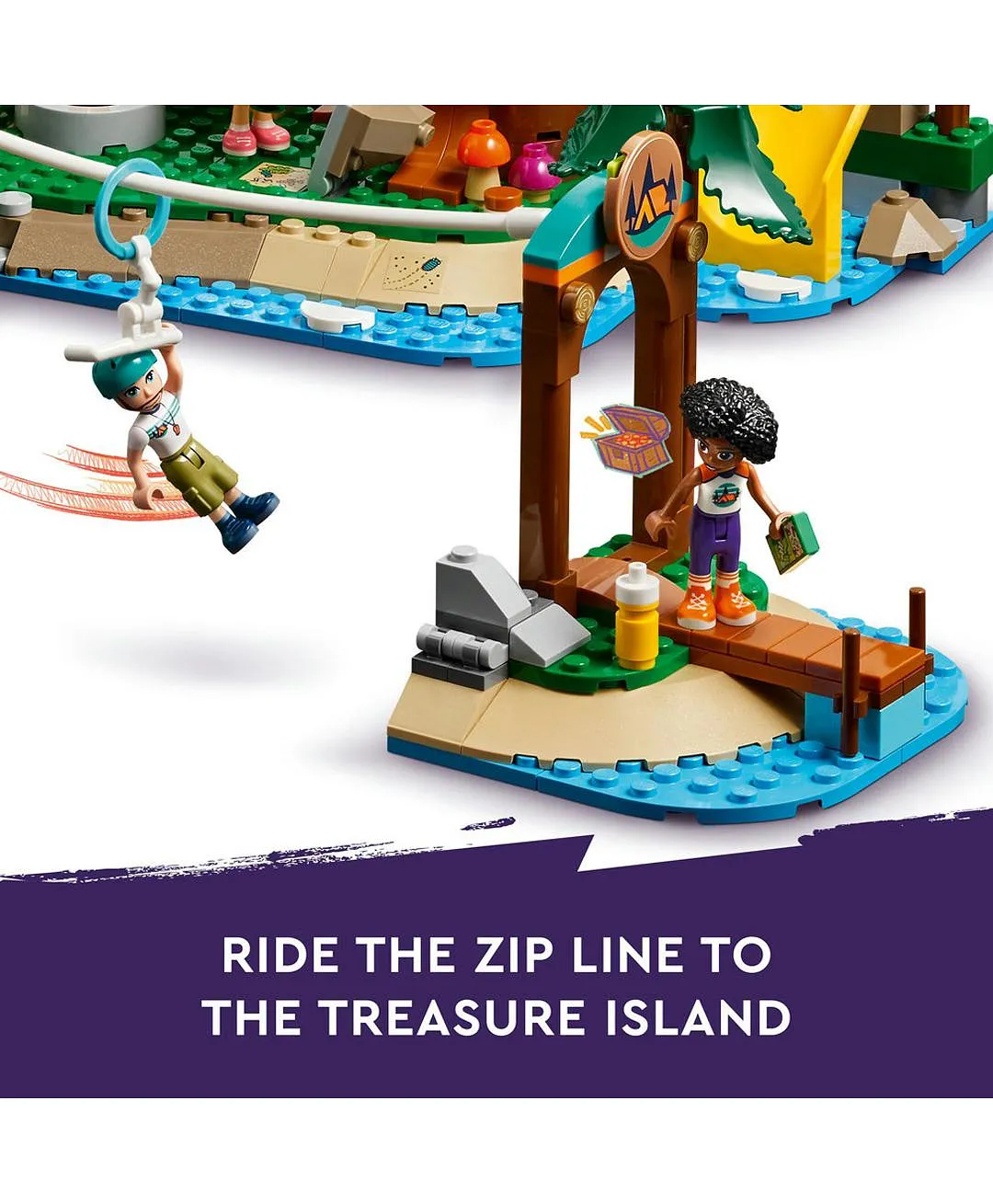 بناء مسار عوائق مع حبل هبوط معلّق – ابنوا مسار العوائق المليء بالتفاصيل، وأظهروا مهارات الشخصيات أثناء الهبوط على الحبل المعلّق أو جدار التسلّق والجسر الخشبي قبل التوجّه لزيارة جزيرة الكنز